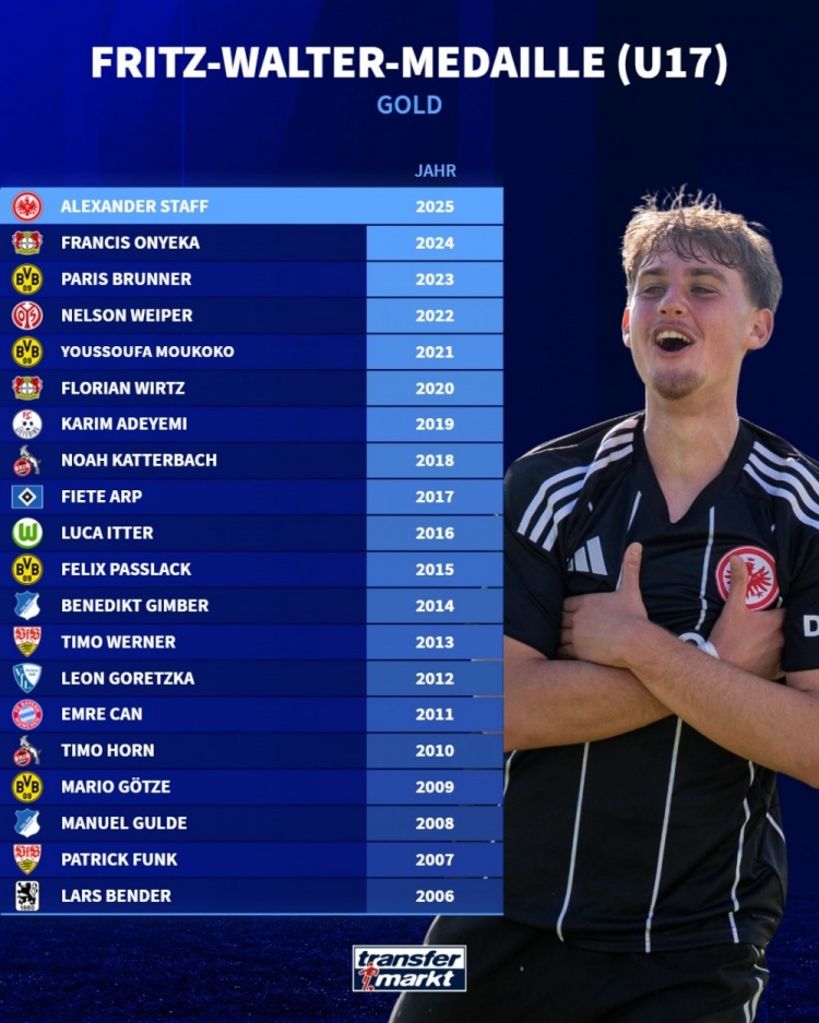 10月17日讯 法兰克福先锋斯塔夫当选德国U17年度最好少壮,德国转会市集列出了往届德国U17年度最好少壮名单。