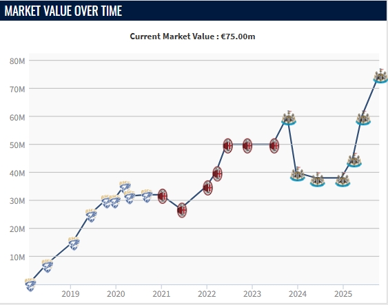 现效率纽卡的托纳利身价高涨1500万至7500万欧,成为意大利身价第二高的球员,仅次于8000万欧的巴斯托尼。