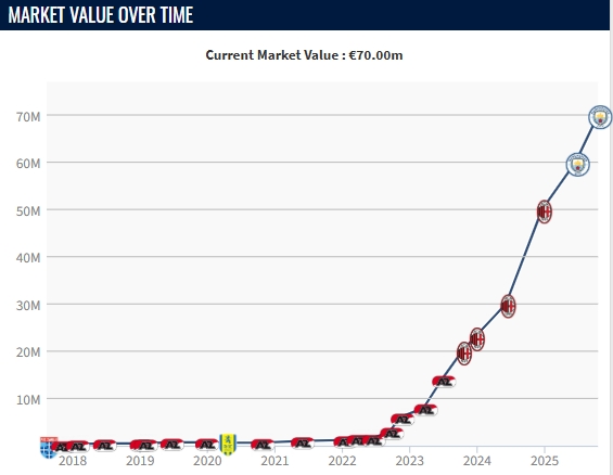 今夏以5500万欧转会费加盟曼城的赖因德斯,身价高涨1000万至7000万欧。
