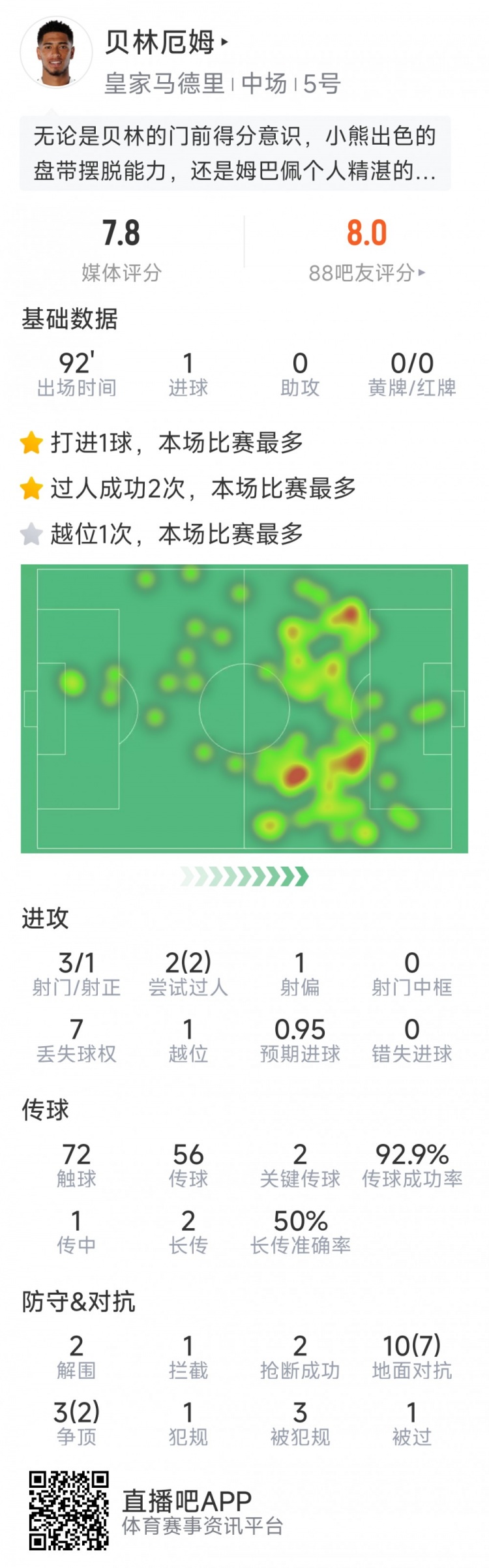 10月23日讯 在本轮欧冠,皇马1-0打败尤文,贝林厄姆打进独一进球。以下为他在本场数据: