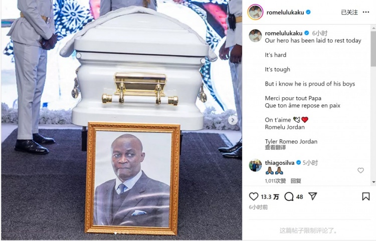 10月24日讯 卢卡库社媒发文,丧祭离世的父亲。