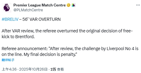 “主裁判文告:‘复核说明,利物浦4号球员的犯规发生在禁区线上。最终判罚为点球。’”