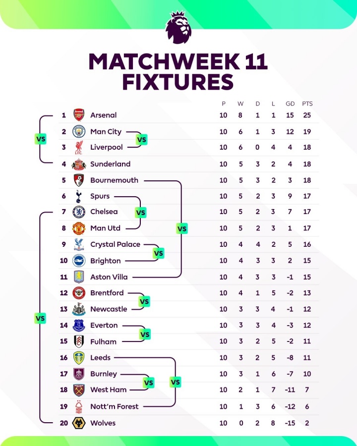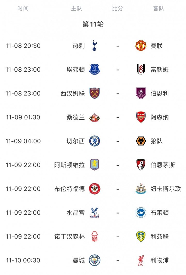 11月07日讯 本周末将迎来英超第11轮的较量,赛前英超官方用一张图表明晰展示了本轮交手各队的排名对比。