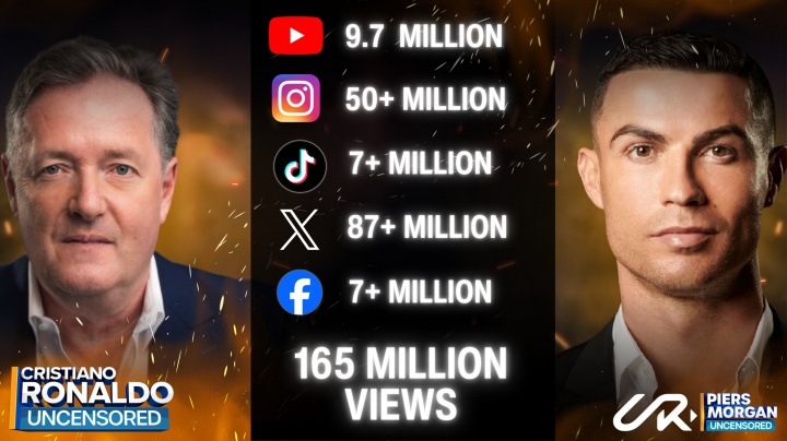 摩根与C罗的独家访谈于上周分两部分发布,划分上线于多个应付媒体平台,其中油管平台浏览量就接近1000万,全平台总不雅看量达到1.65亿。
