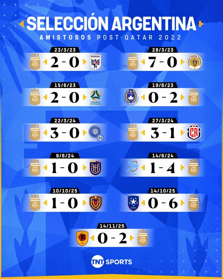 据TNT统计,2022年卡塔尔宇宙杯之后,阿根廷队干涉11场友谊赛,一起取胜。